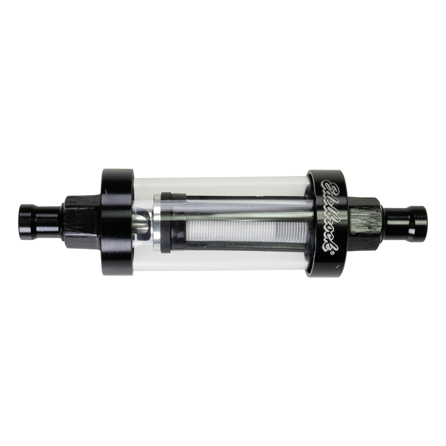 Edelbrock Clear View Fuel Filter for 5/16" I.D. Hose dresses up any carbureted car’s engine bay, providing a quick visual check of fuel flow and condition. Fully machined aluminum ends are laser inscribed with barbed inlet/outlet sizes and attractively E-coated black for durability. For use with rubber fuel lines rated up to 10psi. A serviceable 100-micron nylon filter element keeps dirt and debris from clogging up small passages in your carburetor. The filter element is easily replaced using kit PN 8749. Vehicle Specific